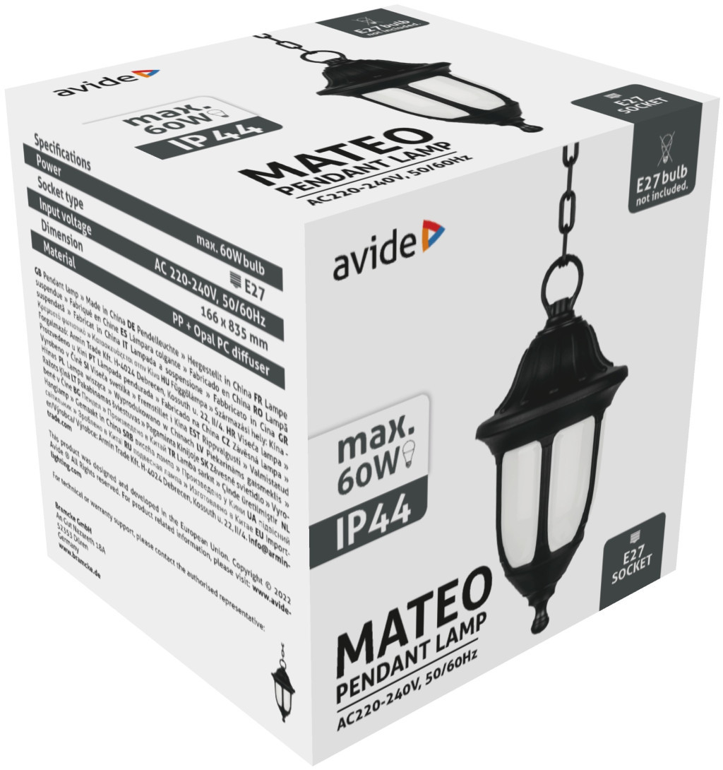 Avide Kültéri Függesztett Lámpa Mateo 1xE27 Fekete IP44