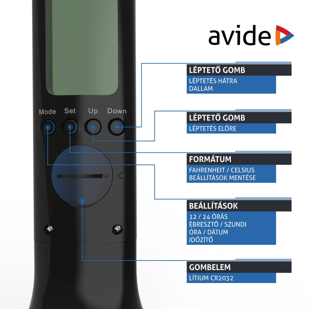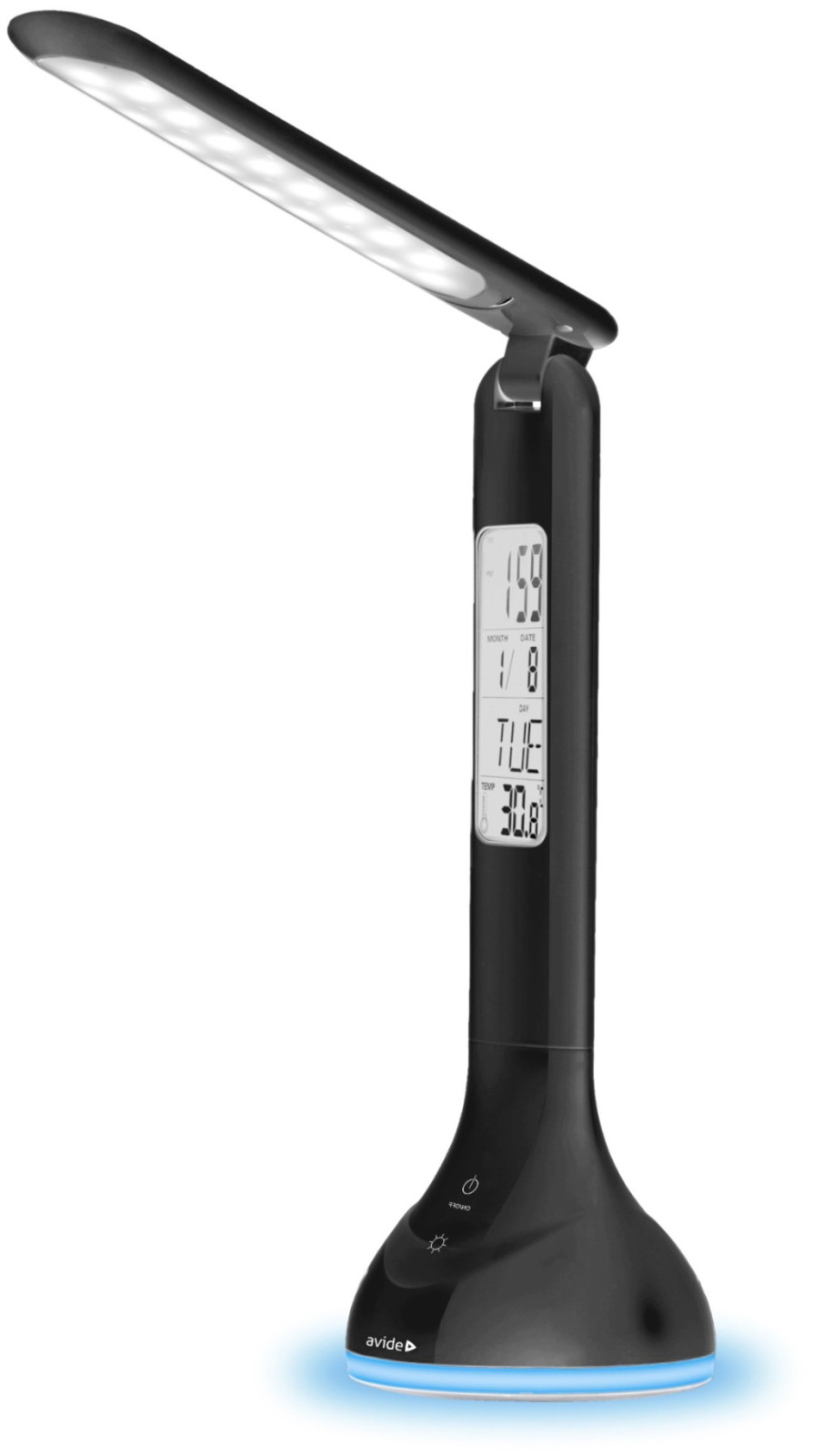 Az Avide RGB Calendar asztali lámpa egy 4W-os teljesítményű, természetes fehér színhőmérsékletű, fényerőszabályozható, LCD kijelzővel, RGB hangulatvilágítással és beépített akkumulátorral is rendelkező termék, mely elérhető fehér, fekete színben valamit fa mintázattal is.