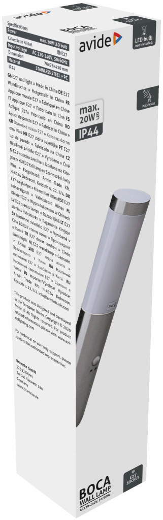 Avide kültéri fali lámpa Boca 1xE27 PIR IP44 Szatén Nikkel