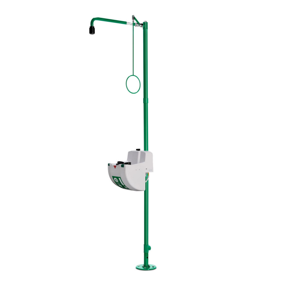A szabadon álló ipari biztonsági zuhanyok minden olyan helyen használhatók, ahol a zuhany falra szerelése nem lehetséges, vagy ahol központi hozzáférési pontot kell létrehozni az elsősegélynyújtáshoz. Nagy ipari csarnokokban és termelési létesítményekben is érdemes használni őket. Nagy előny, hogy a zuhanyzó minden oldalról jól látható. A szabadon álló vészhelyzeti zuhanyok opcionálisan a helyi körülményekhez igazíthatók, a kiegészítők széles választékával. Nagy teljesítményű zuhanyfej a visszafogott, egyenletes és lágy vízsugárért a vegyszerek szemből történő kiöblítésére optimalizálva. A robusztus kialakítás alkalmas a mindennapi nehézipari használatra is. Tökéletes beállítást biztosít a vészhelyzeti testzuhany a helyszíni veszélyes helyzetekhez igazodva a percenként 50 és 110 liter közötti választható térfogatáramnak köszönhetően. Önleeresztő, nagymértékben vízkőmentes és karbantartásmentes, valamint nagyon tartós és korrózióálló. Az állítható vészhelyzeti testzuhanyok a helyszíni körülményekhez igazodnak. Vegyszerálló poliészter porbevonat az agresszív környezetben való használatra. Vízbemenet: 1 ??-es hüvelyes. Testzuhany áramlási sebessége: 75 l/perc | 20 GPM. Szemzuhany áramlási sebessége: 14 l/perc.