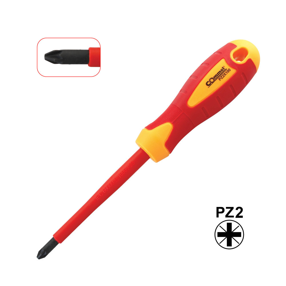 A Commel szigetelt csavarhúzó professzionális elektromos munkákhoz készült. A mágnesezett vég és az ergonomikusan kialakított markolatt megkönnyítik a használatot. Az IEC 60900 szabvány szerinti tanúsítás.1000 V feszültségig.Csavarhúzó méret:PZ2 6x100mm