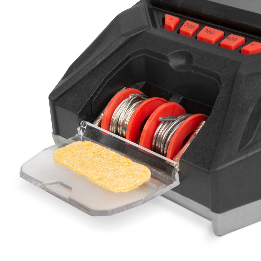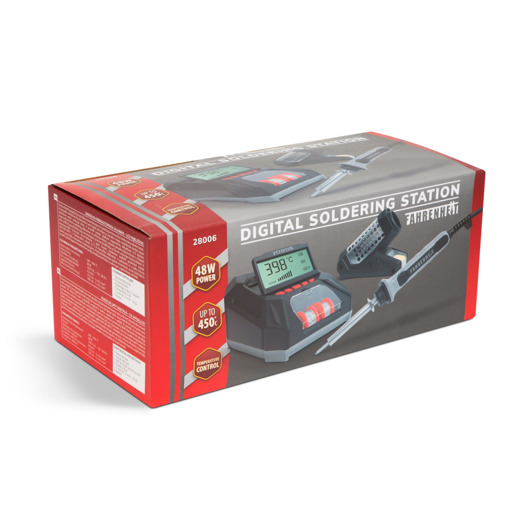 A Fahrenheit legújabb forrasztóállomásával könnyen és hatékonyan forraszthat elektronikai alkatrészeket. A kompakt méretének köszönhetően nem foglal sok helyet az asztalon, mégis rendelkezik minden olyan funkcióval amire szüksége lehet. A készülék tetején található nagyméretű, felhajtható LCD kijelzőn nyomonkövethető a pákahegy pillanatnyi- és célhőmérséklete, valamint aktuális teljesítménye is. A kijelző alatt található gombokkal nagy tartományban, precízen beállíthatja az Önnek szükséges hőmérsékletet. A legnépszerűbb forrasztási hőmérsékletek a gyors kezelés érdekében dedikált gombokat kaptak (200-300-400°C). A hőmérséklet szintek 10°C-os lépcsőben állíthatóak. A pákatartó és a páka hosszú kábele garantálja a kényelmes munkavégzést. A forrasztóállomásba épített óntartónak, szivacstartónak és tartalék pákahegynek köszönhetően pedig mindig kéznél lehet a szükséges segédanyag, tartozék.