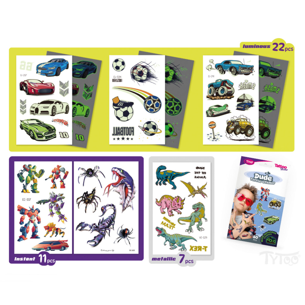 Minden ami vagány! Könnyen felvihető, egyszerű és látványos tetkók, szettben. Ezek az ideiglenes tetoválás matricák kiváló minőségűek, így hosszabb ideig, napokig is megőrzik élénk színüket és részletgazdagságukat. Könnyen felhelyezhetőek és eltávolíthatóak, anélkül hogy irritálnák vagy károsítanák a bőrt. 40 db változatos vagány matrica tetoválás 6 db íven: Autók, Transformers, foci, kígyó, skorpió és persze dínók.