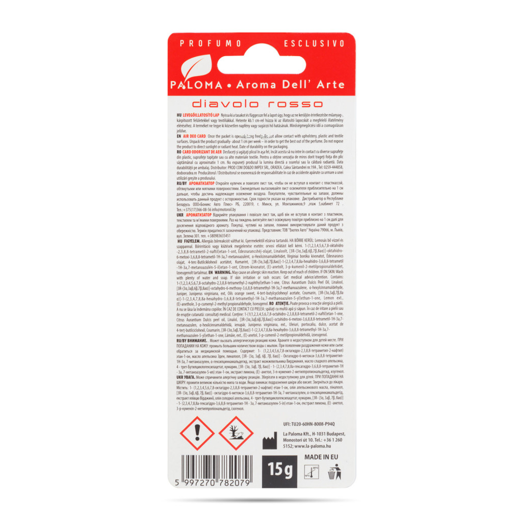 A Paloma Aroma Del 'Arte illatosító család eleganciájával és kifinomultságával minden utazást különlegessé varázsol! A modern dizájn és a letisztult színvilág egyaránt kifinomult és stílusos megjelenést biztosít autójában. Az illatosító kellemes, friss illatával frissességet és tisztaságot hoz a jármű belső terébe. Ideális választás mindazok számára, akik nemcsak az illatra, hanem az autójuk belső terének harmóniájára is nagy hangsúlyt fektetnek.