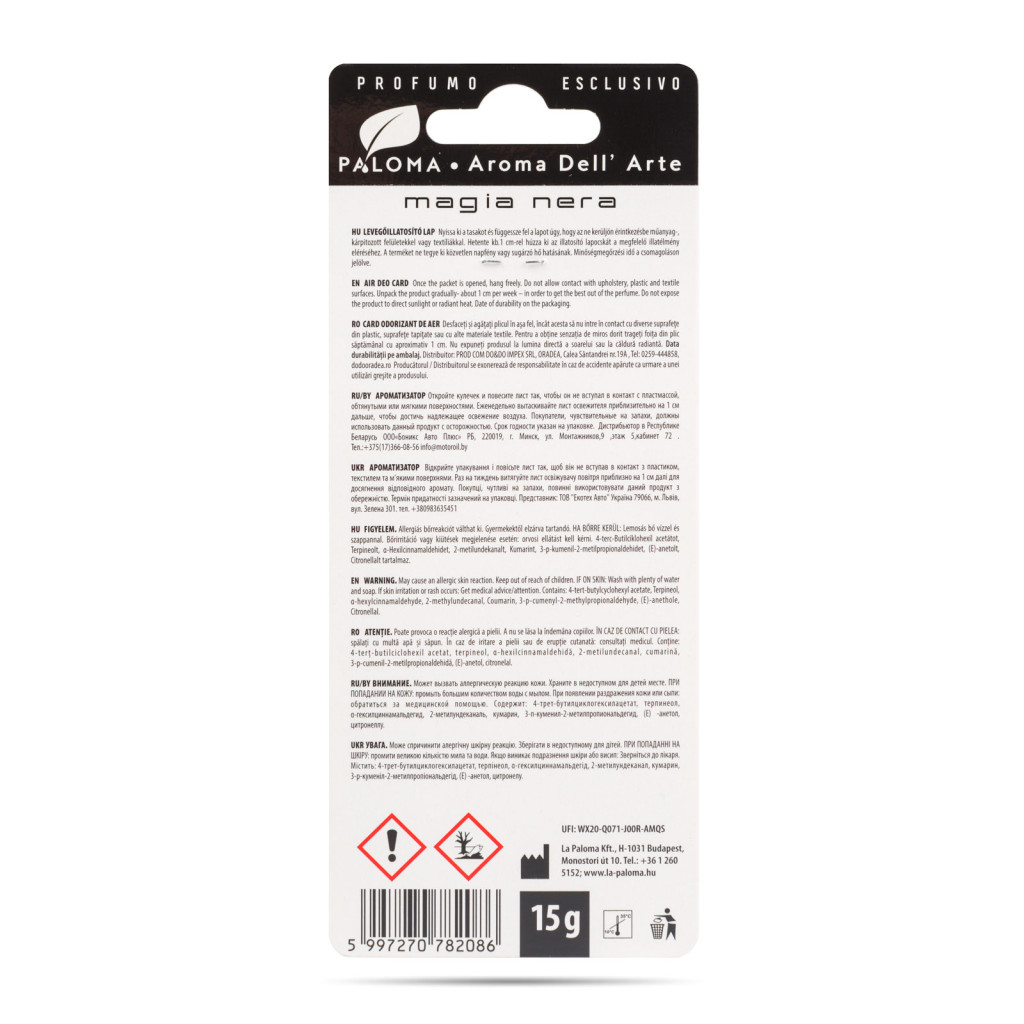 A Paloma Aroma Del 'Arte illatosító család eleganciájával és kifinomultságával minden utazást különlegessé varázsol! A modern dizájn és a letisztult színvilág egyaránt kifinomult és stílusos megjelenést biztosít autójában. Az illatosító kellemes, friss illatával frissességet és tisztaságot hoz a jármű belső terébe. Ideális választás mindazok számára, akik nemcsak az illatra, hanem az autójuk belső terének harmóniájára is nagy hangsúlyt fektetnek.