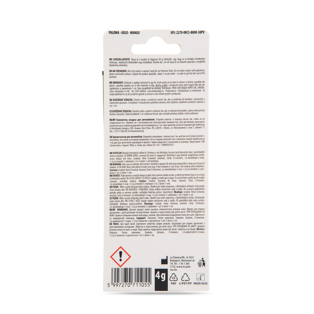 Frissítse fel autója levegőjét Paloma Gold illatosítóval és élvezze a kellemes utazást minden kilométeren!