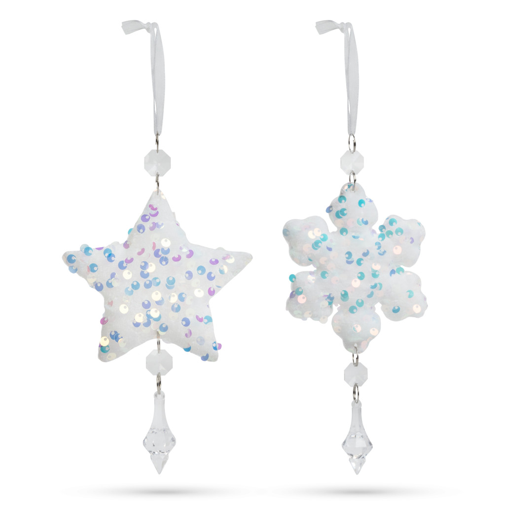 Klasszikus karácsonyi hópehely, csillag dísz, amely bármelyik karácsonyfa ékes dísze lehet. A glitteres felületen megcsillanó fények meghitt hangulatot teremtenek és ragyogással töltik be a karácsonyfát. A fénytörléseknek köszönhetően lilás, sárgás színekben játszik, attól függően, hogyan esik rá a fény.