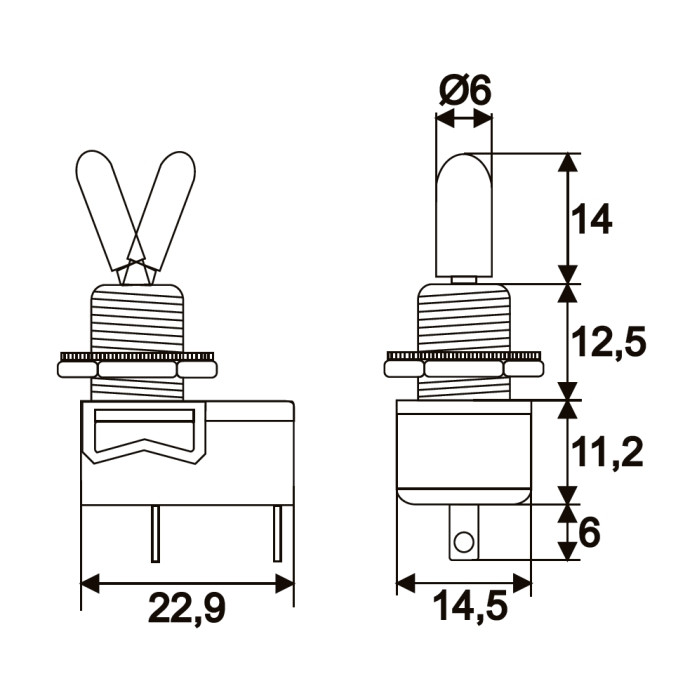 Karos kapcsoló szigelt kapcsolókarral, fém kivitel, kiválóan alkalmas műszaki gépek, berendezésekbe történő beépítésre. A piros műanyag szigetelésnek köszönhetően könnyen megkülönböztethető zsúfolt kapcsolótáblákon. Maximum 2 A-ig terhelhető.