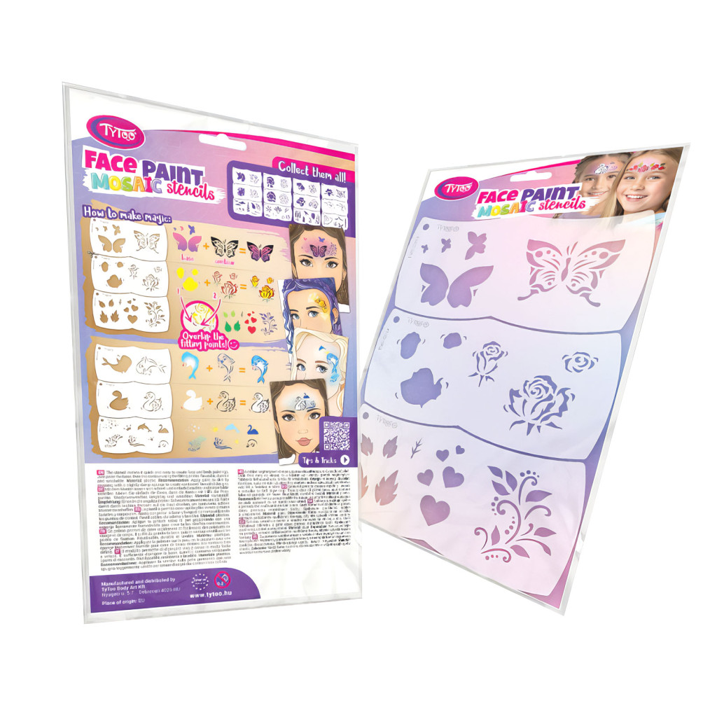 Hatalmas öröm a gyerekeknek egy arcfestés, amit a TyToo Mosaic sablonokkal, rajztudás nélkül Ön is elkészíthet otthon. A TyToo Mosaic sablonja segítségével könnyedén festheti meg, az Ön által kiválasztott mintát. A sablon formája úgy van kialakítva, hogy tökéletesen illeszkedjen egy kisgyerek arcára, és könnyen kezelhető legyen, így a használata is rendkívül kényelmes. A minták részét képező illesztési pontok megkönnyítik a minták pontos egymásra helyezését, el is veheti és ugyan oda vissza is teheti festés közben.
