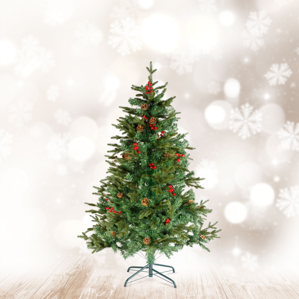 Varázsoljon meghitt ünnepi hangulatot otthonába, ezzel a klasszikus zöld műfenyővel! A sűrű ágrendszer és a dús, élethű tűlevelek és a piros bogyók természetes hatást keltenek, így tökéletes alternatívát nyújtanak az élő fenyő helyett. A tartós anyagból készült műfenyő hosszú éveken át megőrzi szépségét, miközben nem hullatja tűleveleit.