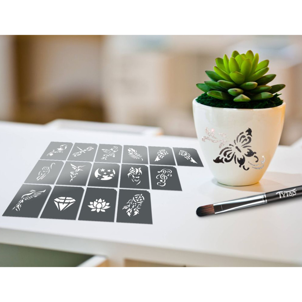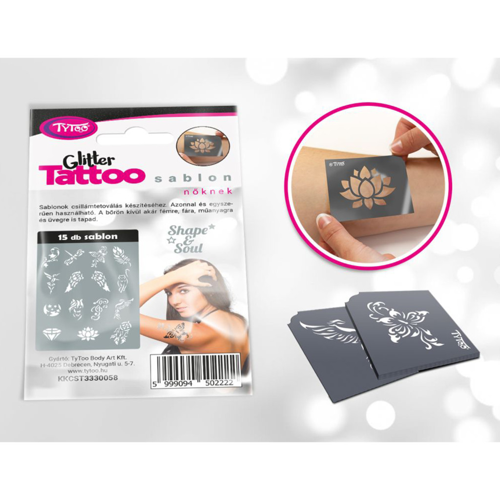 A csomagban található sablonok segítségével női csillámtetoválás mintákat készíthet, melyeket egyéb testfestéshez is felhasználhat.