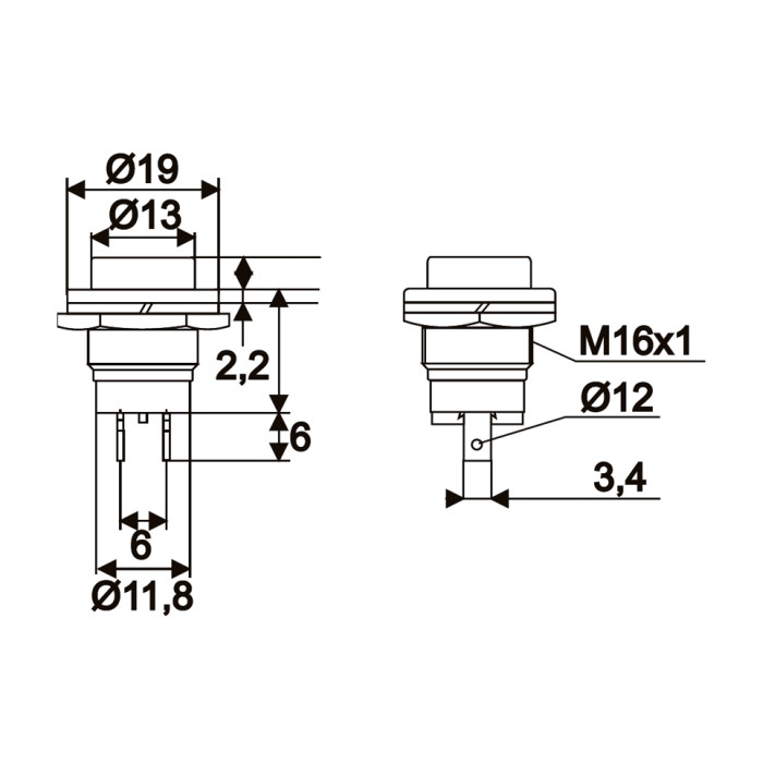 Beépíthető zöld, kör alakú nyomógomb. Széles körben elterjed, beépíthető műszaki / elektromos készülékek kezelőpaneljébe. Megbízható típus, fém foglalattal és műanyag gombbal. A kapcsoló alapállapota nyitott, a gomb nyomásakor záródik az áramkör.