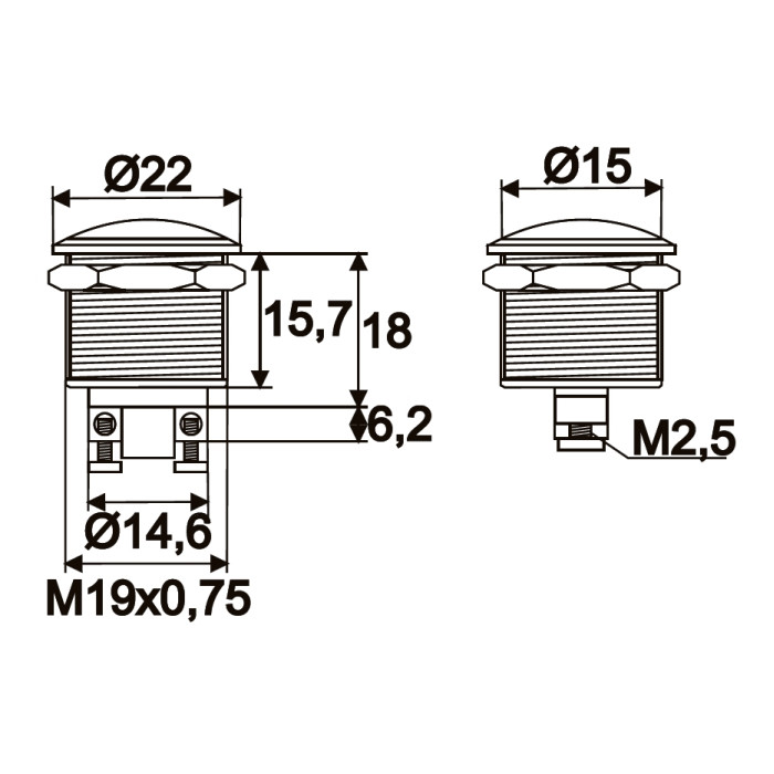 Beépíthető, süllyesztett fém kapcsoló. Széles körben elterjedt, előnye, hogy nagyon kis mértékben emelkedik ki a kezelőpanel síkjából. Tartós, jó minőségű kivitel, kör alakú fém nyomógombbal. A nyomógomb alapállapotban nyitott, a gomb megnyomásakor zárja az áramkört.
