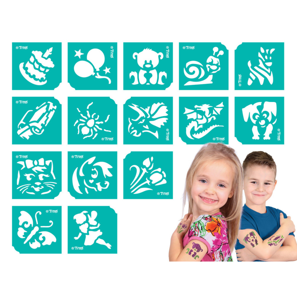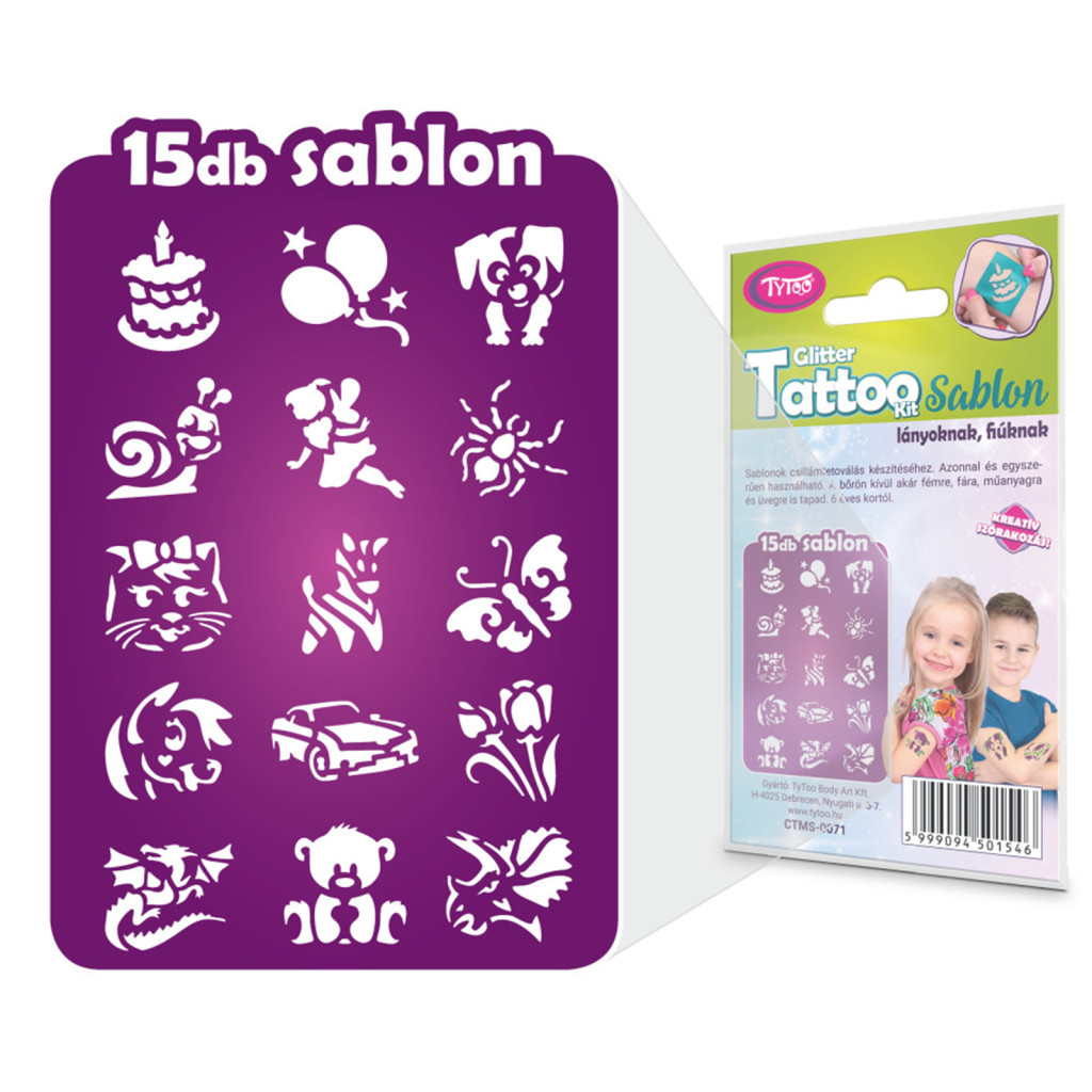 A sablon szett 15 db, gyerekeknek készült szülinapi mintát tartalmaz, melyeket használhat csillámtetováláshoz, vagy egyéb testfestéshez. Olyan slágermintákat kap egy csomagban, mint a cica, maci, kutya, csiga vagy sárkány, melyek biztos örömet szereznek a gyerekeknek.