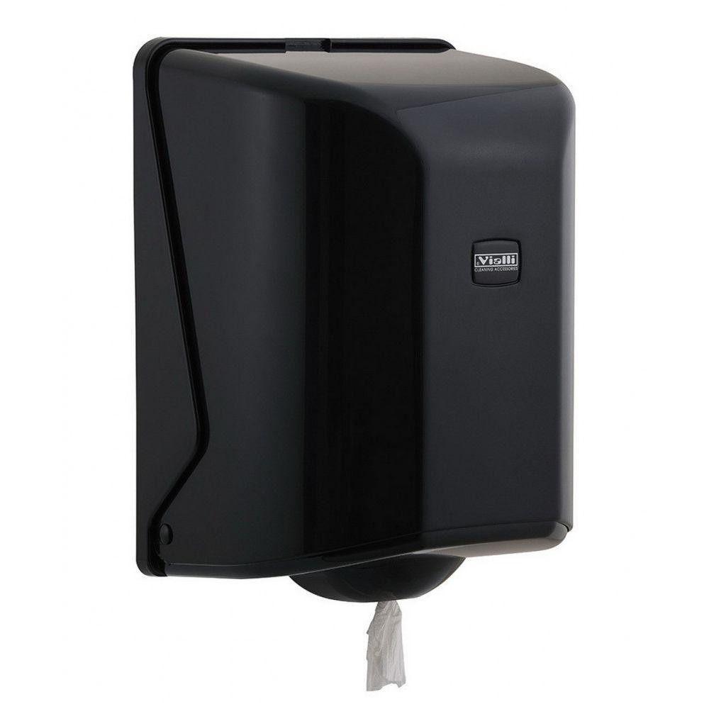 Vialli tekercses kéztörlő adagoló pont adagolással. Fekete színben az exkluzívabb megjelenésért. A papírt egy szűkített nyíláson keresztül lehet kihúzni az adagolóból, ezáltal a perforáció mentén elszakad, így egyszerre csak egy lap kerül a felhasználó kezébe. 19 cm átmérőjű, perforált, belső mag adagolású tekercses kéztörlő papírral használható.