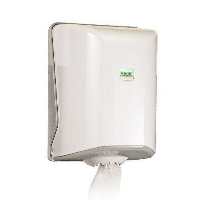Vialli tekercses kéztörlő adagoló. 19 cm átmérőjű belső mag adagolású papír kéztörlővel használható. Az adagoló nyílása tépőfogakkal van ellátva, így perforált és perforáció nélküli papírral is használható.