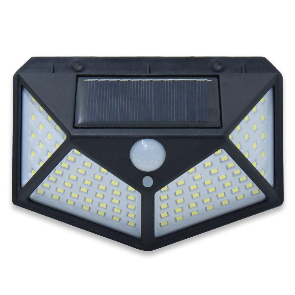 A 100 ledes napelemes fali lámpa mozgásérzékelővel 100 db nagy fényerejű SMD leddel, beépített napelemmel, fény- és mozgásérzékelővel rendelkezik.