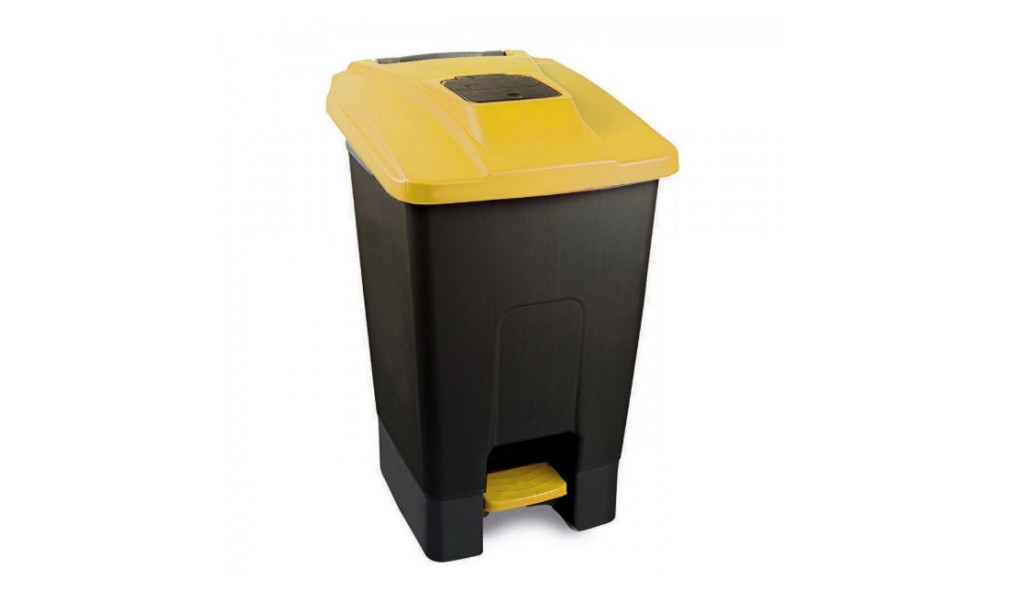 Szelektív hulladékgyűjtő konténer, műanyag, pedálos, fekete/sárga, 100L