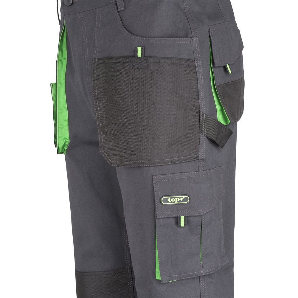 A TOP GREEN 100 P egy 100% pamutból készült, strapabíró derekas munkanadrág, amely hagyományos fazonjával és praktikus kialakításával a legkeményebb munkakörnyezetekben is megbízható társ. Anyaga szikraálló, így különösen ajánlott fémmegmunkálási munkákhoz, mint hegesztés, köszörülés vagy egyéb nehézipari tevékenységek.